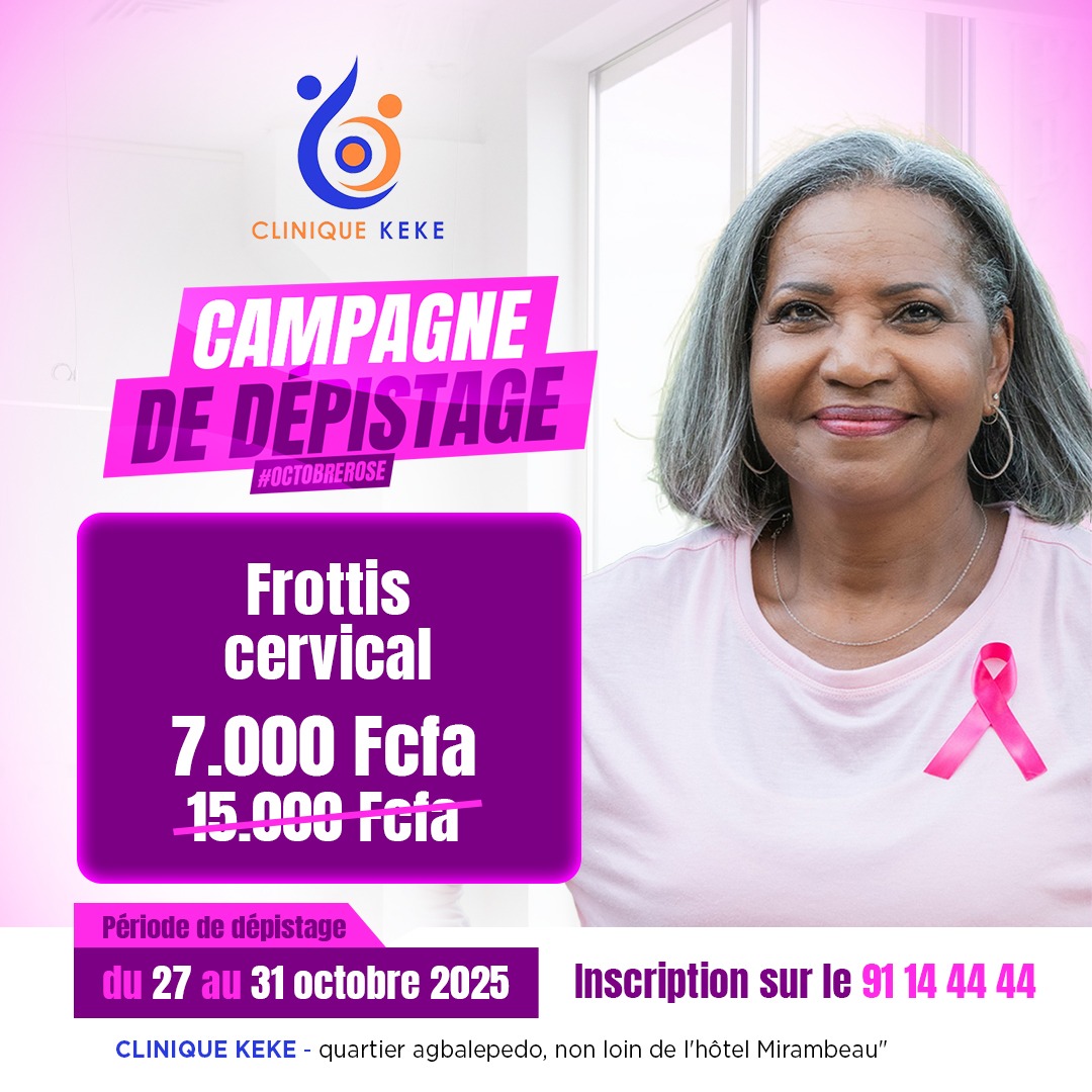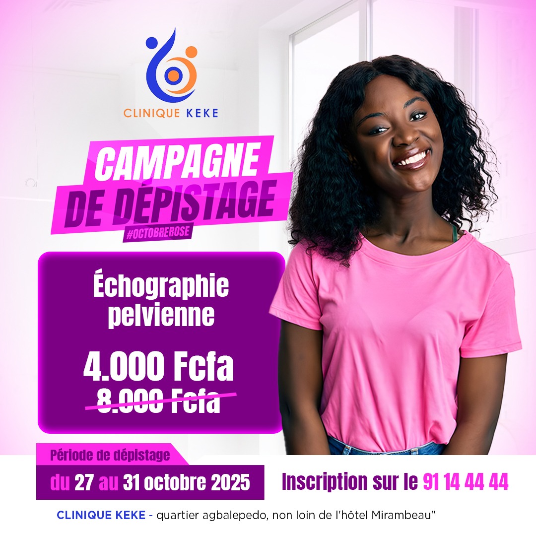 Dans le cadre de la célébration du mois d’Octobre Rose, mois mondial de sensibilisation au dépistage du cancer du sein et du col de l’utérus, la Clinique KEKE lance une vaste campagne de dépistage gratuit du 27 au 31 octobre 2025 dans ses locaux.